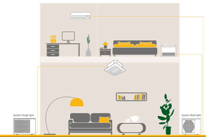 Jest kilka sposobów na montaż klimatyzacji w domu lub mieszkaniu. Najprostszym jest montaż typu Split, inaczej 1;1 czyli jedna jednostka wewnętrzna połączona do agregatu na zewnątrz. Montujemy klimatyzator na ścianie pod sufitem. W takim systemie schładzamy jedno pomieszczenie, chyba że mamy powierzchnię otwartą to grawitacyjnie możemy schłodzić większą powierzchnię. Inny rozwiązanie jest, gdy zamierzamy schłodzić lub ogrzać kilka pomieszczeń naszego mieszkania lub domu. W tedy rozwiązaniem jest system Multi-Split pozwalający na zamontowanie jednego agregatu na zewnątrz i nawet do 8 jednostek wewnątrz. Takie rozwiązanie jest w szczególności dobre jeżeli nie mamy możliwości zawieszenia lub postawienia więcej ilości jednostek zewnętrznych.A co w przypadku, gdy nie mogę lub nie mam miejsca na ścianie pod sufitem? W takim przypadku mamy możliwość zamontowania klimatyzatora przypodłogowego, można porównać go do eleganckiego kaloryfera, ponieważ zamontowany jest kilkanaście centymetrów na podłogą i zasadę działania ma identyczną jak zwykły klimatyzator.